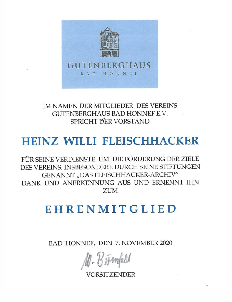 Heinz Willi Fleischhacker ist Gründungsmitglied des Vereins Gutenberghaus Bad Honnef e.V. von 2013 und hat schon im selben Jahr dem Verein sein seit 2002 aufgebautes und mehrere hundert Bände umfassendes Zeitungsarchiv für Honnef und Umgebung übereignet. Er hat es seither kontinuierlich betreut, gerade auch in den sehr schwierigen Zeiten diverser Umzüge, bis es im Juni dieses Jahres seinen dauerhaften Platz in der Konrad-Adenauer-Schule am Rheingoldweg 16 gefunden hat.